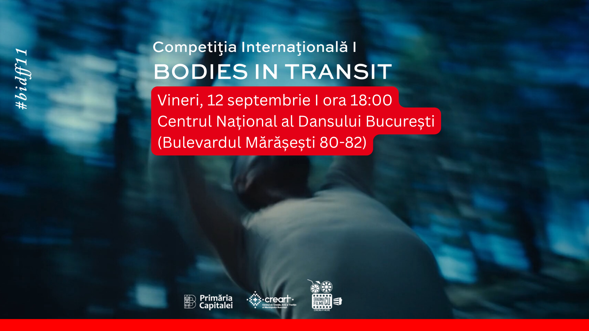 🗓 Vineri, 12 septembrie, la ora 18:00, va avea loc 🎥 𝐁𝐎𝐃𝐈𝐄𝐒 𝐈𝐍 𝐓𝐑𝐀𝐍𝐒𝐈𝐓 // 𝐂𝐨𝐦𝐩𝐞𝐭𝐢𝐭̦𝐢𝐚 𝐈𝐧𝐭𝐞𝐫𝐧𝐚𝐭̦𝐢𝐨𝐧𝐚𝐥𝐚̆ 𝐈, în cadrul Bucharest International Dance Film Festival #𝟏𝟏, la Centrul Național al Dansului București (programat inițial în data de 11 septembrie la Grădina cu Filme).