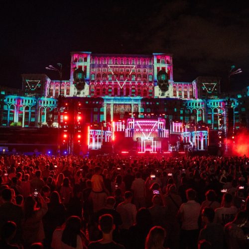 Music vibes were kept alive by Varer, Christian Thomson, Adrian Șaguna, Arias, and drummer Emil Vergo, the night culminating in the much-anticipated set by Belgian DJ HVMZA. His beats, paired with video projections by Dorel Naste (Mindscape Studio) and live façade VJ-ing by Bogdan Nedelcu (Apart Vision), created a stunning multimedia spectacle — an unforgettable open-air party, a dazzling fusion of sound and color that captivated the crowd.