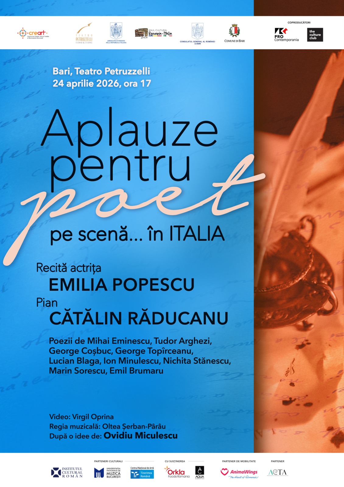 Evenimentul, care va avea loc la Teatro Petruzzelli, unul dintre cele mai mari și prestigioase teatre de operă din Italia, renumit pentru acustica sa excelentă și arhitectura elegantă, un reper cultural al orașului Bari, se înscrie în Anul Cultural România – Italia și propune publicului român din zonă o întâlnire specială cu lirica românească, într-o formulă scenică în care poezia și muzica live se completează și se potențează reciproc.