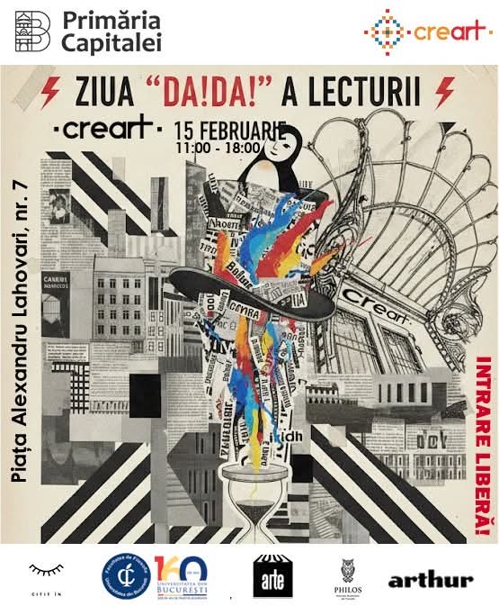 Sediul CREART devine duminică, 15 februarie, între orele 11:00 – 18:00, spațiul unei experiențe culturale exceptionale, de Ziua națională a lecturii. „Ziua DA!DA! a Lecturii”, organizată de Primăria Municipiului București prin CREART cu sprijinul Facultății de Filosofie a Universității București, a Editurii Arthur, a laboratorului artistic interdisciplinar Citit În / orb.ro și al Asociației 1001 Arte, propune o reîntoarcere la plăcerea lecturii prin experiențe artistice și filosofice, sub semnul spiritului DADA. Accesul la evenimente este liber, pe toată durata zilei.