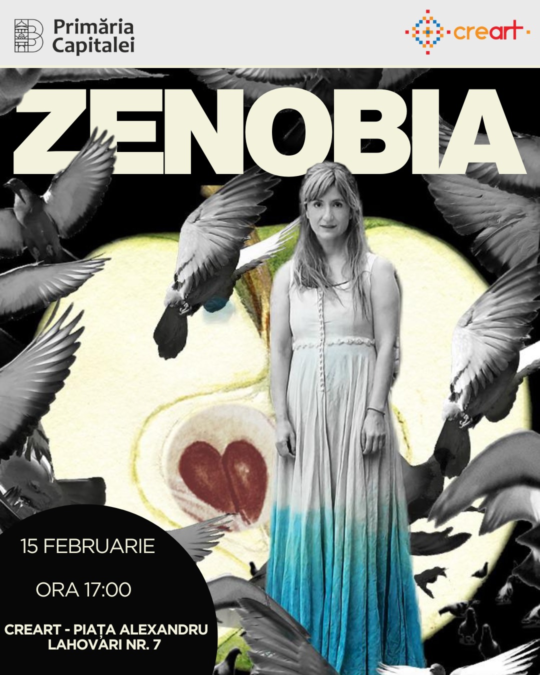 De la ora 17.00, urmează performance-ul „Zenobia”, după romanul lui Gellu Naum, construit ca o scrisoare scenică adresată unei prezențe reale și imaginare deopotrivă. Textul este alcătuit din fragmente din romanul lui Gellu Naum, lecturate direct, șoptite sau repetate, alternând cu momente video, clipe de tăcere sau secvanțe coregrafice. Zenobia nu apare ca personaj distinct, ci ca forță care modelează corpul și vocea, ca absență activă care provoacă transformarea. Întregul performance devine astfel o mișcare de inițiere: o rătăcire care duce în profunzime, unde iubirea nu este un punct de sosire, ci un cerc care se lărgește până la trecerea într-un alt nivel al realului. Acest performance cu actrița Antoaneta Cojocaru reprezintă o primă etapă de lucru a unui spectacol în devenire. Coregrafia este semnată de Ioana Marchidan. Ilustrațiile video sunt realizate de Ruxandra Ilie.
